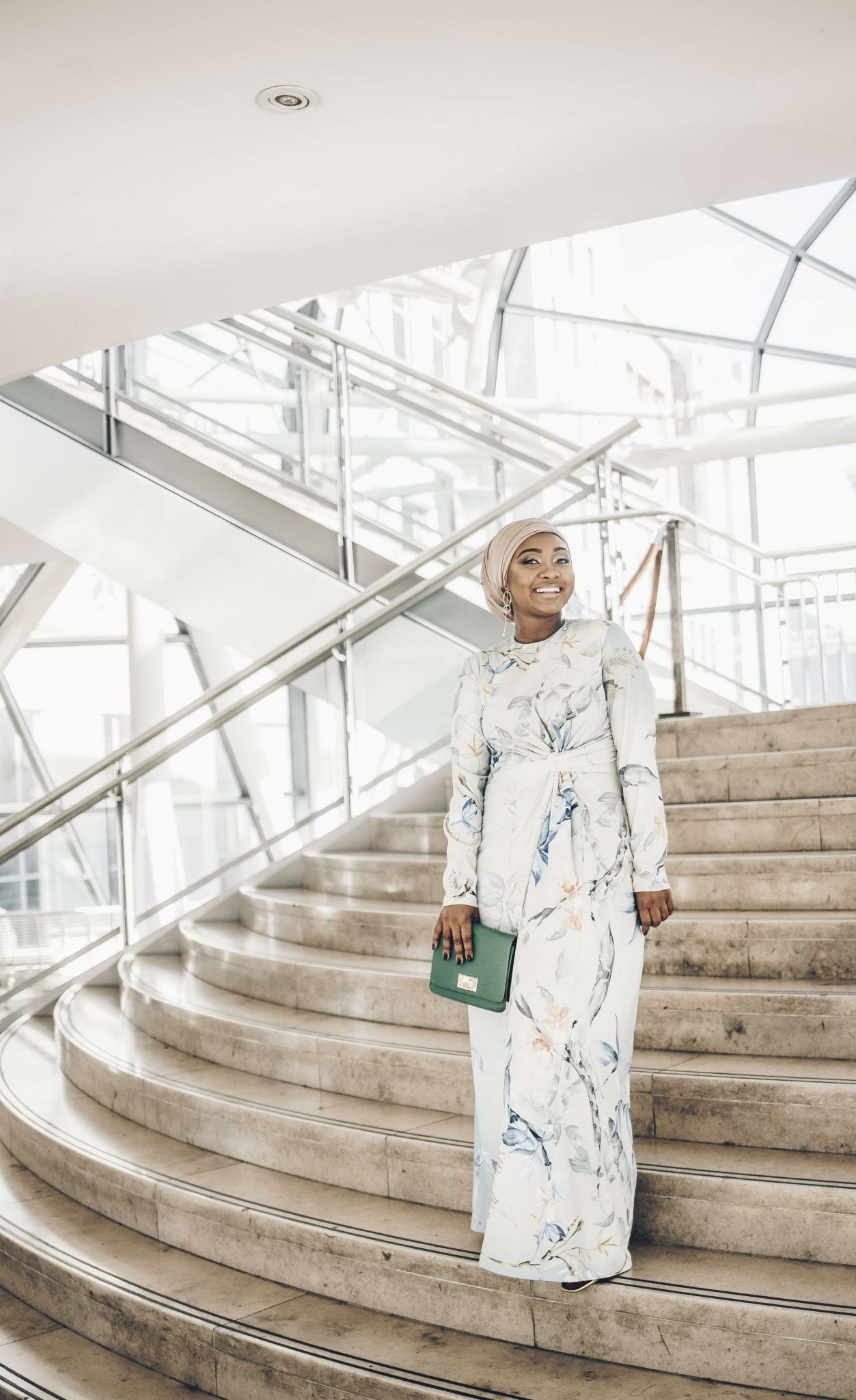 One-piece free-flowing dresses paired with a beautiful light hijab or turban can be the easiest outfit to put together. I love one-piece looks because they give us the chance to get fun with accessories. Finding the perfect earrings, shoes, and makeup look can be the best part of an elegant dress.