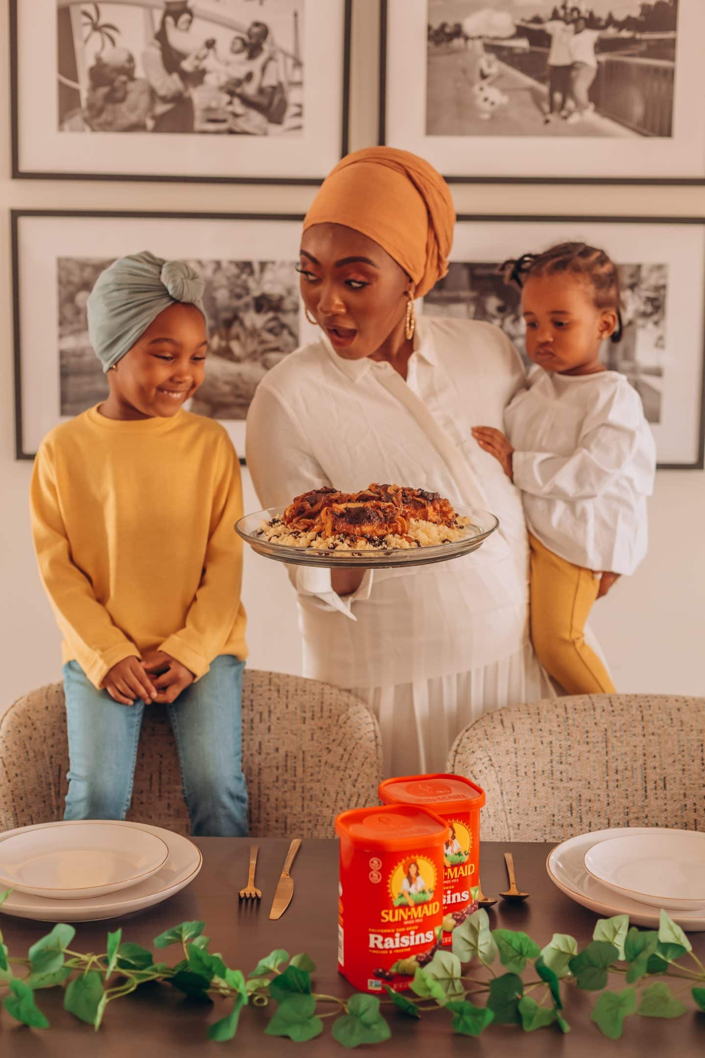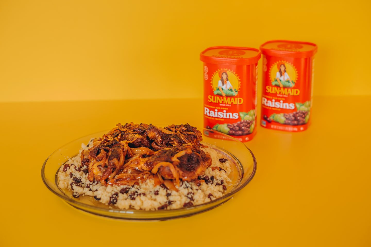 For this recipe, I decided to add Sun-Maid raisins to the couscous for a healthy sweetener. In many cultures, this is a common practice. But for us, it will be something that adds a twist on a family favorite. I use Sun-Maid raisins in particular because they are naturally sweet with zero grams of added sugar. My girls love to snack on them and I love that they’re literally nothing but grapes and sunshine! We bond over this dish because they can enjoy a bowl of raisins while I’m prepping the couscous, making Sun-Maid raisins incredibly versatile. Here are the steps to our Sun-Maid Couscous and Savory Chicken recipe.
