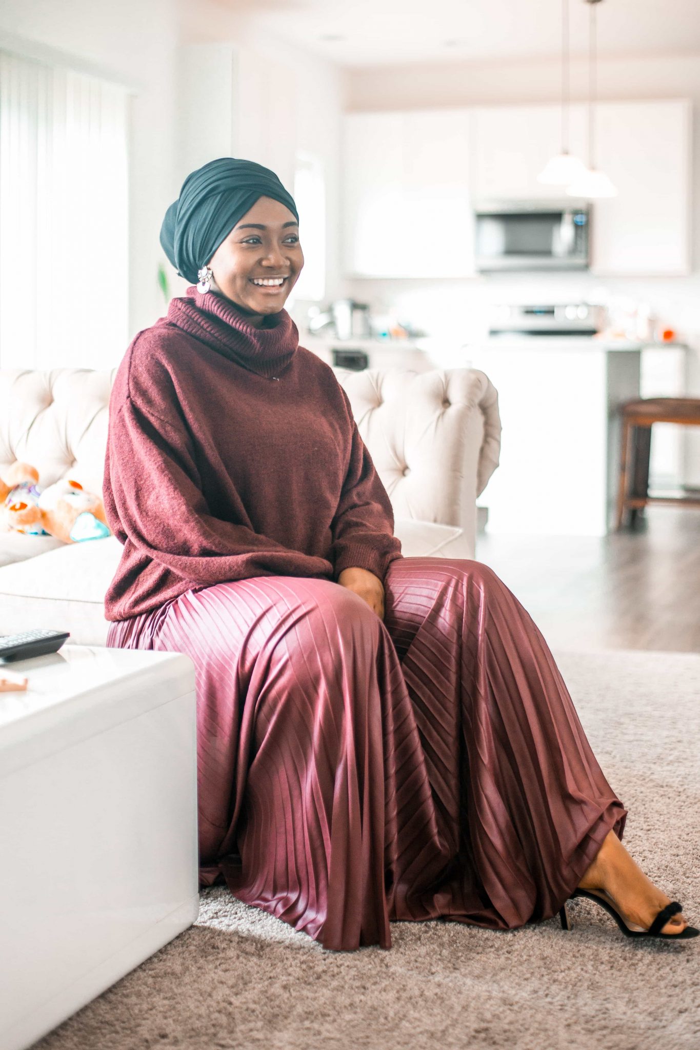 The outfit helps me show off my baby bump without making me feel huge. Plus, I had the perfect earrings to match it with. *Tip: Accessories can tie an outfit together, especially for a turbanista. Add something with hints of colors or a bold size and transform your look.